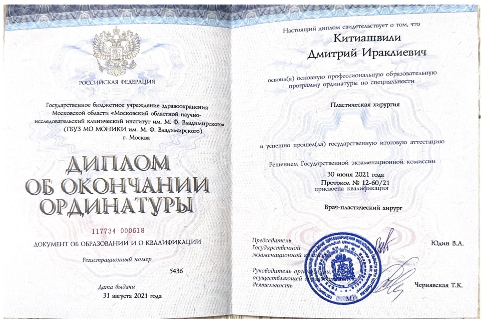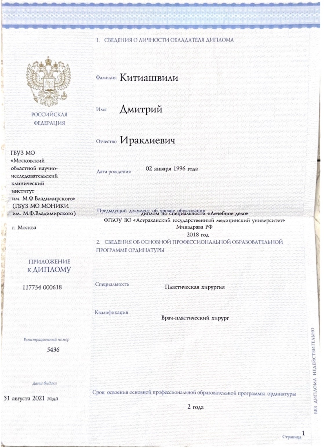 - В 2021 году окончил ординатуру по специальности «пластическая хирургия» в МОНИКИ.