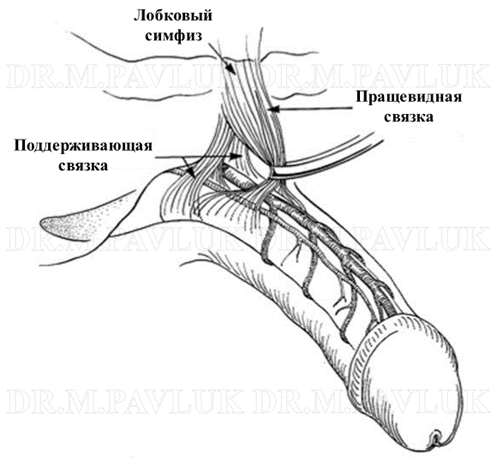 Лигаментотомия - операция по увеличению длины полового члена, посредством пересечения поддерживающей и пращевидной связок пениса. С последующим раскрытием пенопубикального угла и выдвижением скрытой части полового члена.